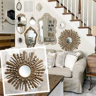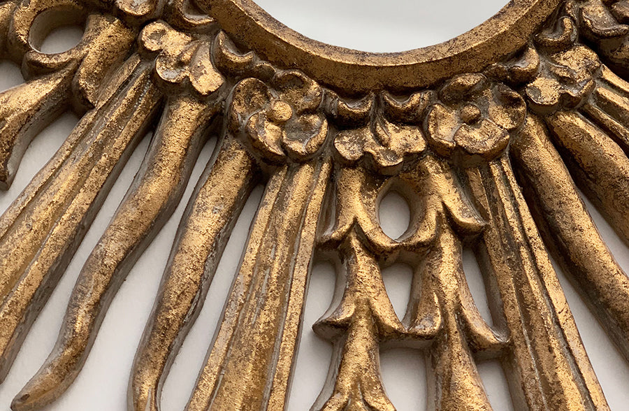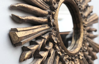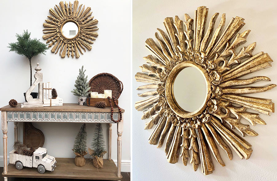We feel SO lucky to bring you this mirror for SO many reasons! This striking European Vintage Gold Sunburst mirror caught the eyes of our buyers while on a shopping trip in an antique mall... but wow! The mirror they saw was SO expensive! But they knew we had to make it happen for our treasured stealers! ... Our buyers remembered every detail of that beautiful gold sunburst mirror and reproduced each and every fine element at a FRACTION of the price! AND IT'S HERE TODAY!