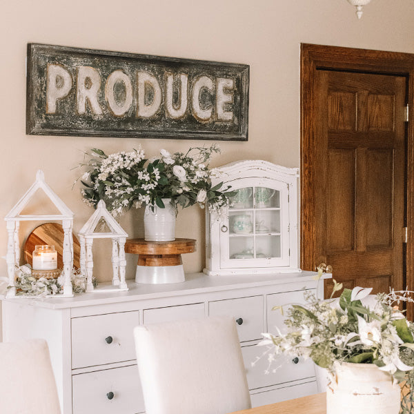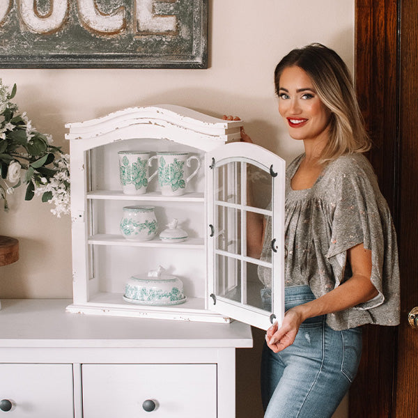 Introducing our stunning Antique-Inspired Country Curio Cabinet! This cupboard is a meticulously crafted beauty with the heart of a true antique. With its wonderfully weathered finish, elegant curved top, and a perfect little latch, it looks like it's been a treasured part of a family for generations. The windowed door and classic glass panes are just waiting to show off all your favorite small treasures, from vintage teacups to little trinkets from your travels.