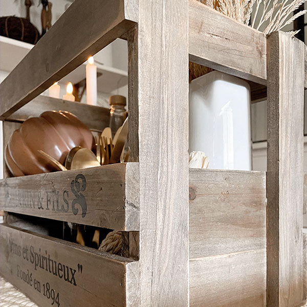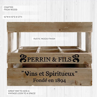 We are SO EXCITED to bring you this Antique-Inspired French Wine Crate beautifully crafted of wood with advertising graphics on the front! Beautifully advertising graphics in french dress up the front of this wine bottle crate. "Vins et Spiriteux; Fonde en 1894," in French translates to "Wines and Spirits; Founded in 1894." We are in love with this perfet stylish storage solution that can hold six wine bottles or anything else your heart desires!