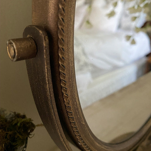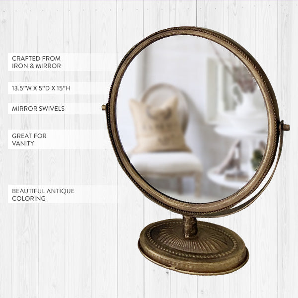 - Mirror frame swivels on a beautiful matching stand