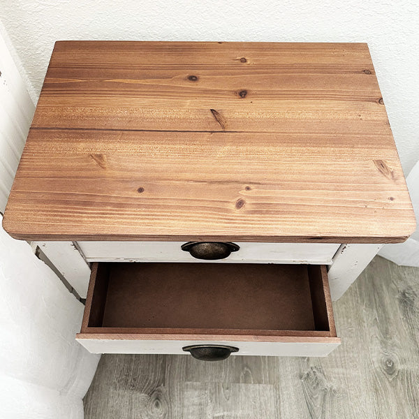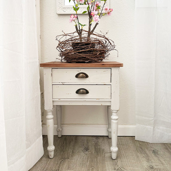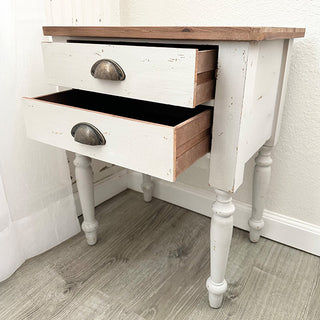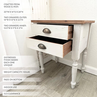 Say goodbye to that boring side table—it’s time for an upgrade! Our Antique Inspired White Side Table with Two Drawers is the perfect way to elevate your farmhouse decor. Combining rustic elegance with vintage appeal, this piece brings timeless charm to any space. The off-white finish with subtle distressing adds a shabby chic touch that radiates warmth and character, making it a standout accent for your home.