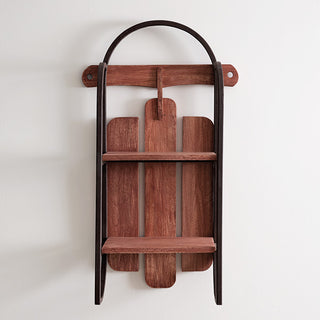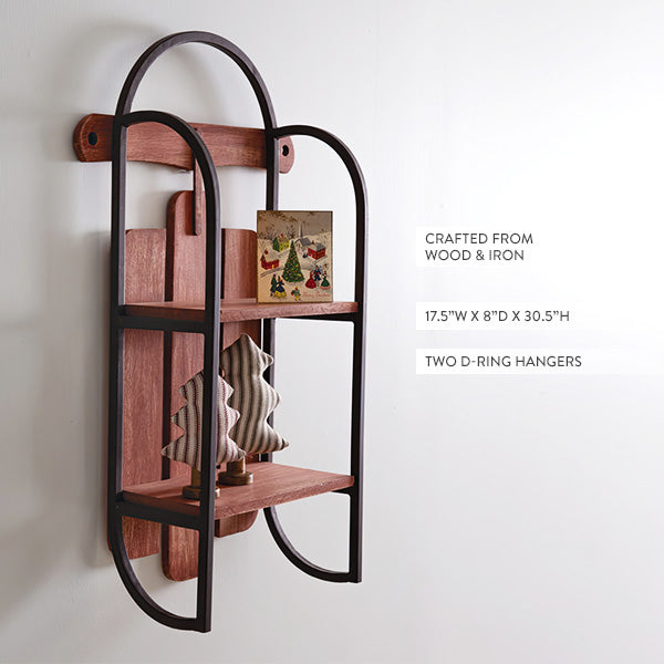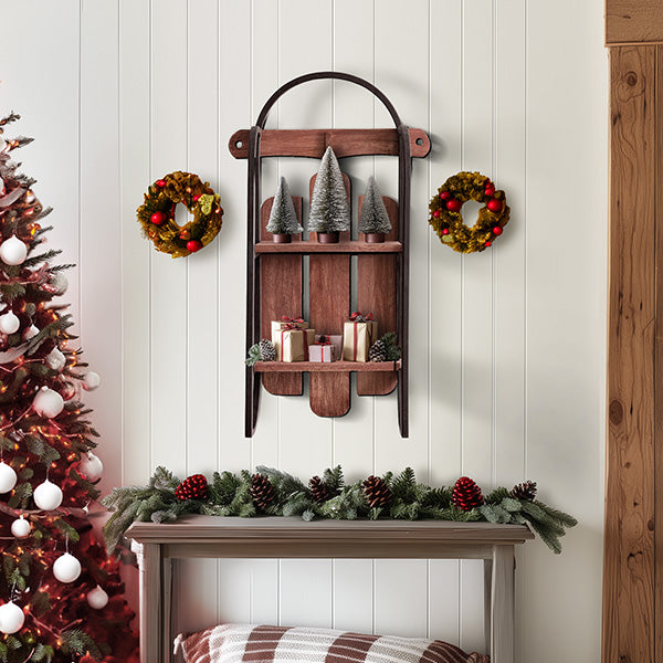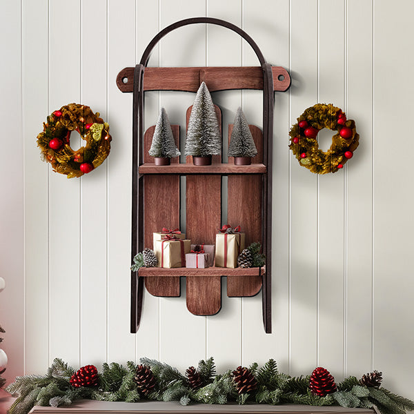 Bring a touch of vintage charm to your Christmas decor with the Two Tier Antique Sled Iron and Wood Wall Shelf. This unique wall shelf is inspired by a classic sled design, combining rustic iron framing and warm wood shelves to add character and storage to any farmhouse-style room. Perfect for displaying your favorite decorative pieces or practical items, it offers both function and style in one eye-catching piece.