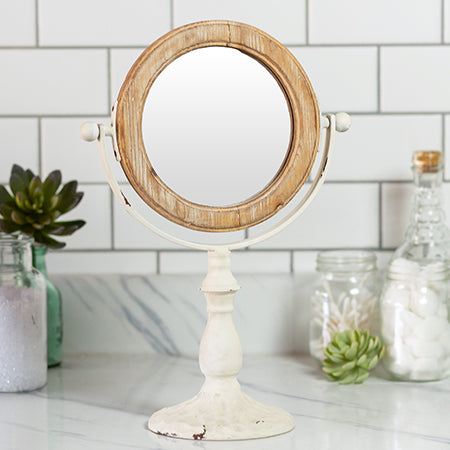 The rustic wood and chippy cream finish of our Distressed Round Tabletop Tilting Vanity Mirror reflects vintage beauty and elegance that is sure to stand out. Great for adding the perfect finishing touch this stunning cast iron and wood tilting vanity mirror will fill any place in your home with its charm and personality.