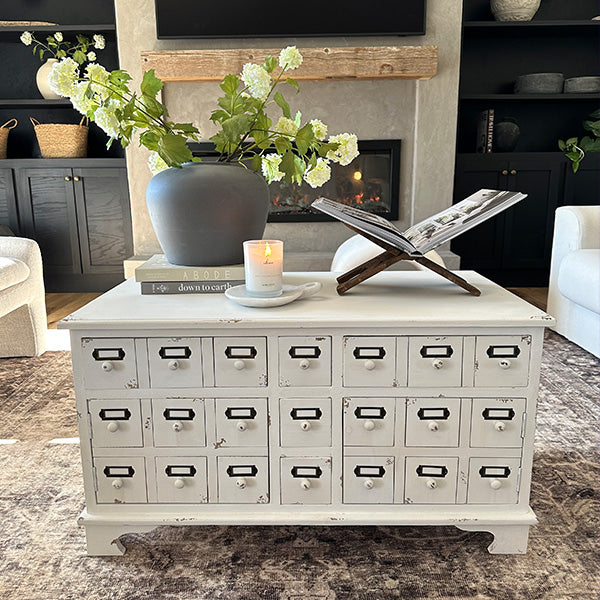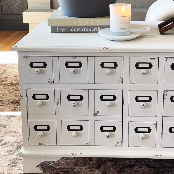 Our one-of-a-kind Distressed Apothecary White Cabinet is crafted with care and custom-designed by our talented buying team. Inspired by the timeless charm of vintage thrift finds, this piece is a perfect blend of character and functionality for your home. But act fast! With seriously limited quantities, it's set to sell out very soon. Don't miss your chance to own this unique treasure!
