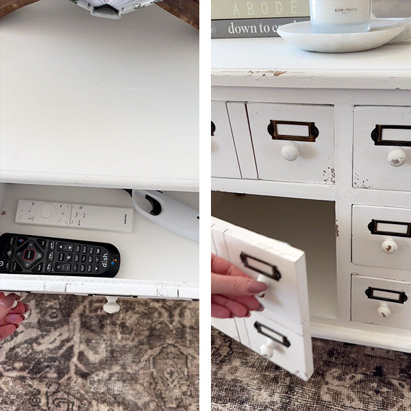 Add a touch of rustic elegance to your living room with our distressed white cabinet. Experience the nostalgia of vintage finds combined with the quality and durability of a brand-new piece.