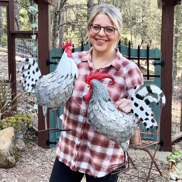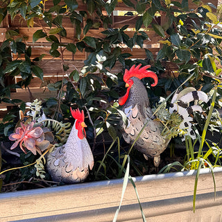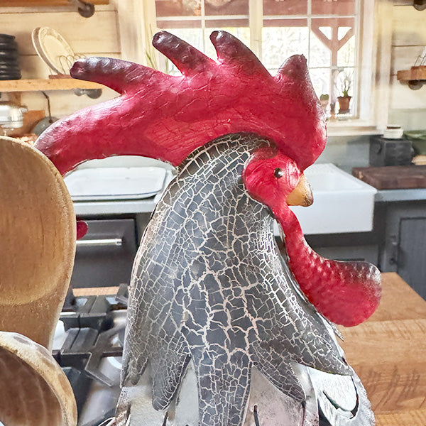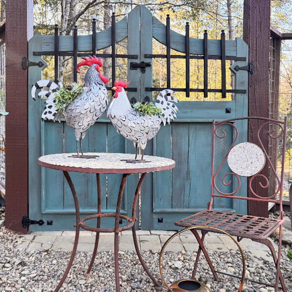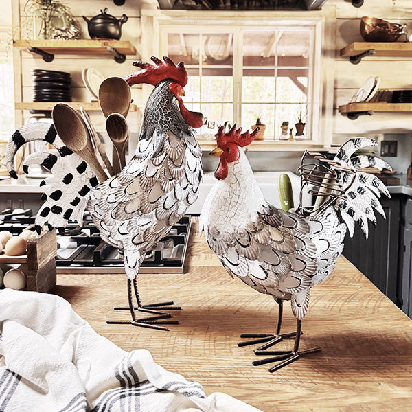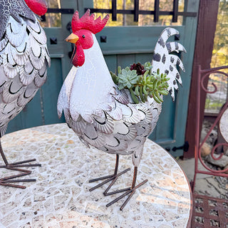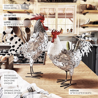 Cock-a-doodle-do! Bring a touch of barnyard whimsy to your home with these charming metal rooster containers. Designed to capture the rustic spirit of farmhouse living, this duo features crackled gray and white metallic feathers, bright red combs, and an artisan-crafted design that blends vintage appeal with modern craftsmanship. These roosters are ready to rule the roost in style!