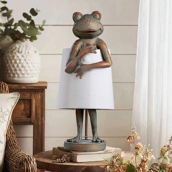 Standing tall at 23 inches, this quirky frog looks like it raided your lamp shade and decided to stay forever, but honestly, who could blame her? Crafted with a rich dark sage and aged copper finish, this lamp is the perfect mix of charm and character.