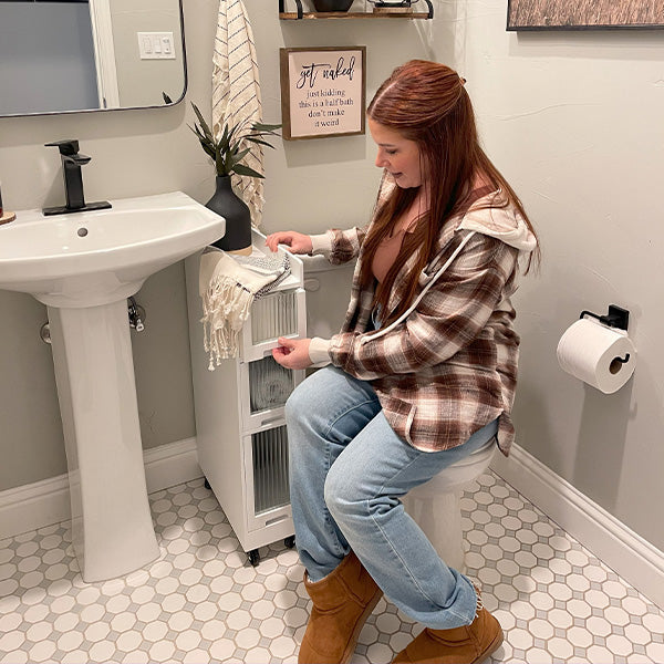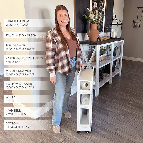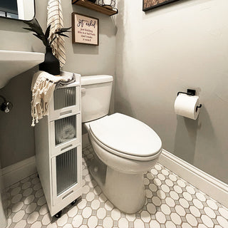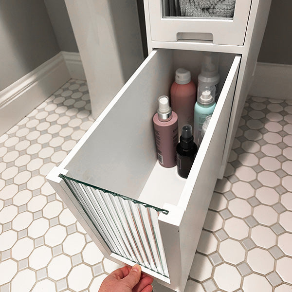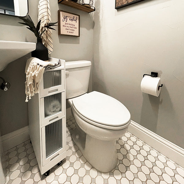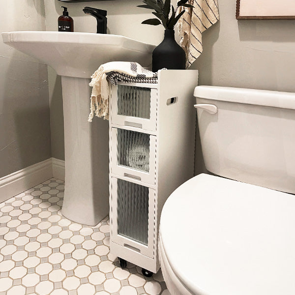 Maximize your bathroom storage without sacrificing style! Our Rolling Three-Tier Narrow Bathroom Storage Cabinet is the perfect solution for small spaces, offering a sleek and functional design. With its slim white frame and three frosted glass-fronted drawers, this cabinet keeps your essentials organized while adding a touch of modern elegance.