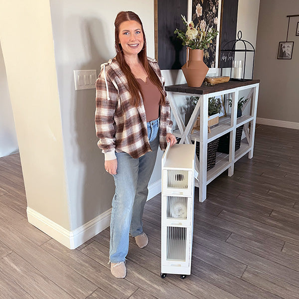 Why clutter your space when you can organize in style? This rolling cabinet offers a chic and functional storage solution that fits seamlessly into any home!