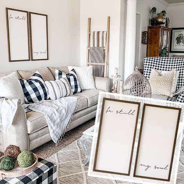These sweet Be Still My Soul Signs are great for the bedroom or living room! Hang this set above your bed, near your couch or aboWeve the mantel! LOVE the idea of this being the center of your gallery wall, surrounded by photos of your loved ones!