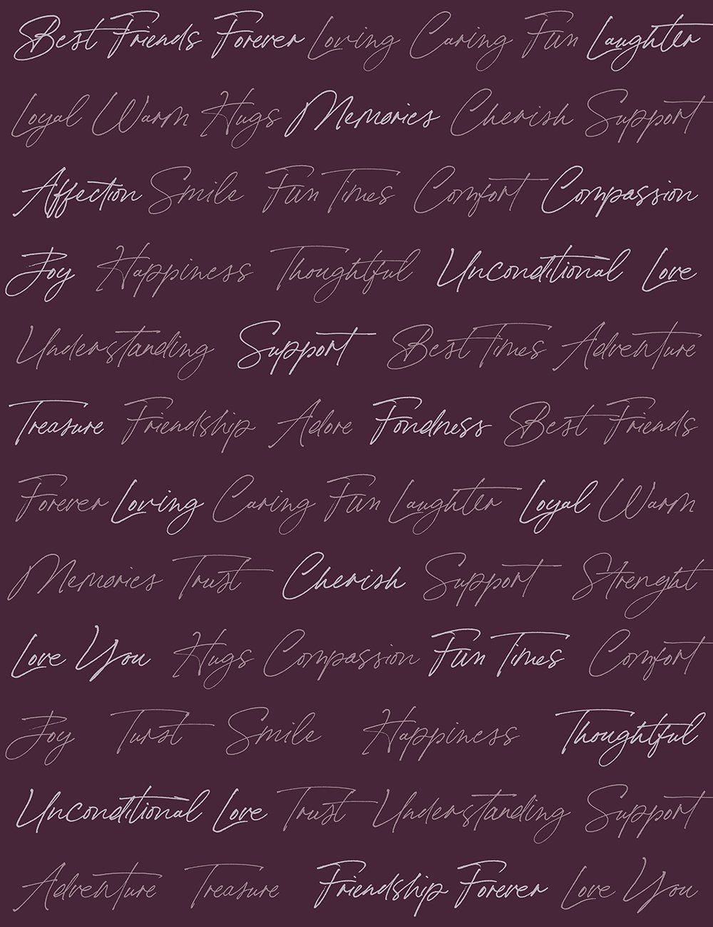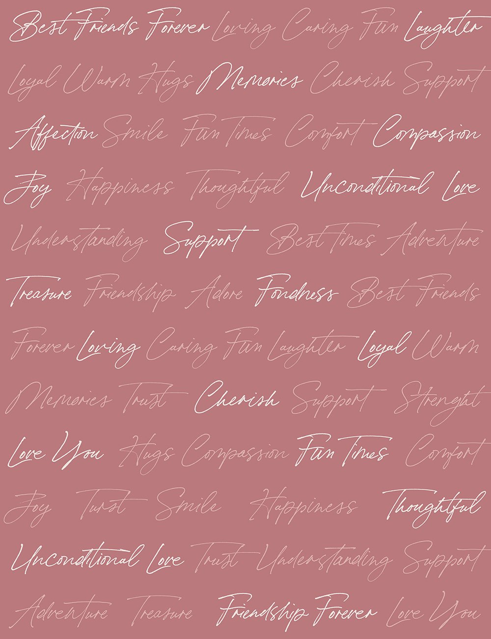 Featured Words: Best Friends Forever Loving Caring Fun Laughter Loyal Warm Hugs Memories Cherish Support Affection Smile Fun Times Comfort Compassion Joy Happiness Thoughtful Unconditional Love Understanding Treasure Adore Fondness Trust Love You Strength Adventure