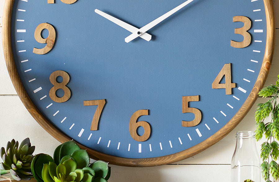 Featuring a soft blue face sleek white arms and raised wood numerals the unique style and minimalist look of this round wooden trim wall clock will make a statement wherever you showcase it.