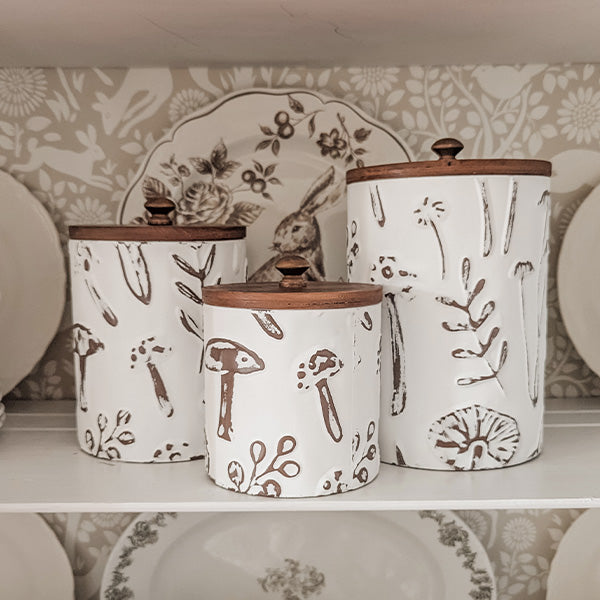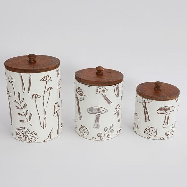 Each container features a creamy white ceramic base decorated with delicate, hand-drawn mushroom and botanical illustrations. Finished with warm walnut wood lids and rounded wooden knob handles, they add instant rustic charm to shelves, counters, and tabletops.