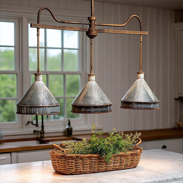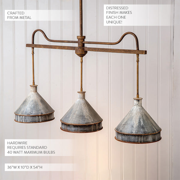 This linear light fixture is a statement piece with all the charm and character of a genuine, rustic antique. Its beautifully distressed metal finish and unique funnel-shaped shades bring a one-of-a-kind feel to any room. We are completely obsessed with its ability to add a bold touch of farmhouse style over a kitchen island, a dining room table, or even in an entryway.