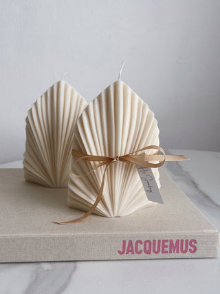 Stunning palm leaf shaped sculptural candle that will make a statement in your home. This is our largest candle crafted, yet. Hand-poured natural soy wax in available in Unscented and a luxurious Cashmere Vanilla scent.