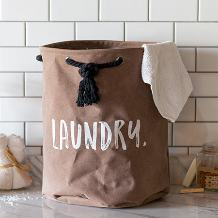 Transform your laundry room into a space full of organized style with our Canvas Laundry Basket. This charming brown canvas laundry bag features a black rope accent and reads ”Laundry” in beautifully distressed white lettering.