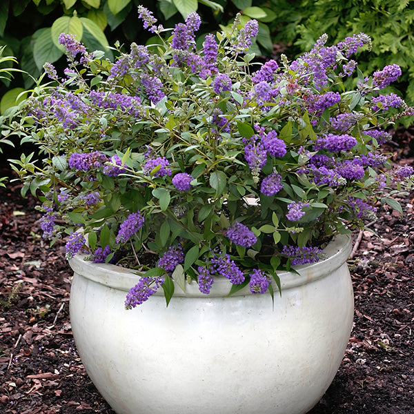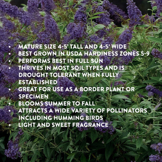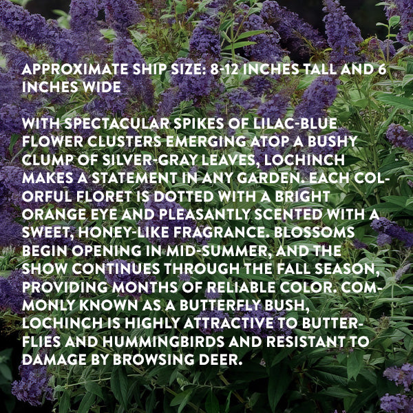 With spectacular spikes of lilac-blue flower clusters emerging atop a bushy clump of silver-gray leaves, Lochinch makes a statement in any garden. Each colorful floret is dotted with a bright orange eye and pleasantly scented with a sweet, honey-like fragrance. Blossoms begin opening in mid-summer, and the show continues through the fall season, providing months of reliable color. Commonly known as a butterfly bush, Lochinch is highly attractive to butterflies and hummingbirds and resistant to damage by browsing deer.