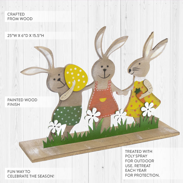 Crafted with care, our bunny family is treated with a poly spray, making it suitable for outdoor use. Whether adorning your front porch, garden, or patio, these playful bunnies will add a festive flair to your outdoor Easter display.