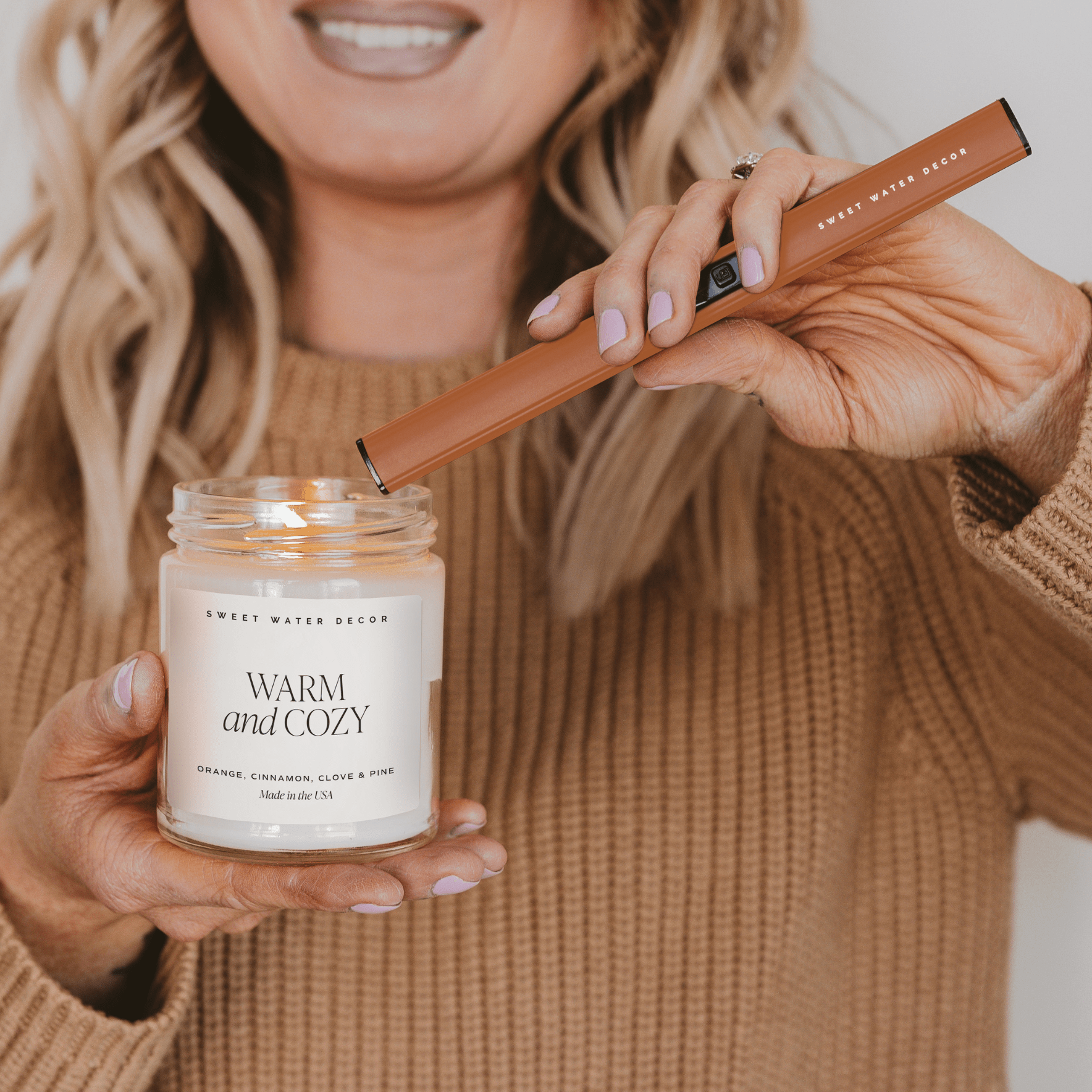 Introducing our sleek and modern rechargeable electric lighter, designed with both style and sustainability in mind. Its ultra-thin profile and stylish burnt orange finish make it a chic accessory. With a quick 1-2 hour charge, it's ready for hundreds of uses. Pair it with our signature Sweet Water Decor candles for the perfect gift that combines elegance and practicality.