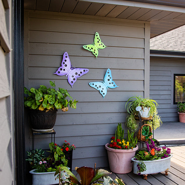 Bright Summer Colors: In shades of blue, green, and purple, these butterflies bring vibrant energy to walls, gardens, or covered porches.