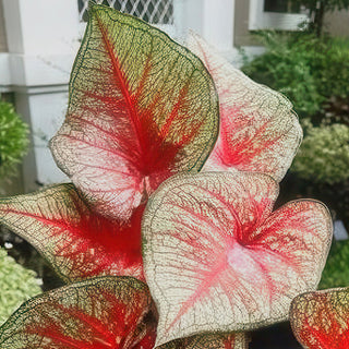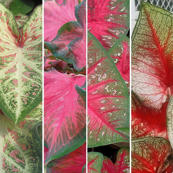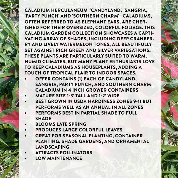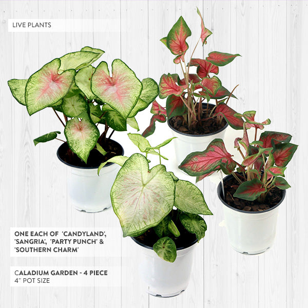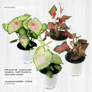 Transform your outdoor space with our Caladium Garden, Set of 4, featuring four LIVE plants bursting with lush, heart-shaped leaves. Known for their dramatic foliage and easygoing nature, caladiums are the ultimate go-to for brightening up shady spots, containers, borders, and porch pots.