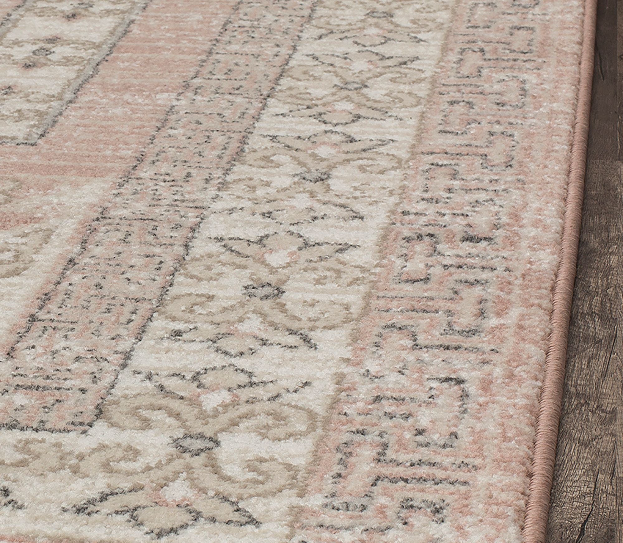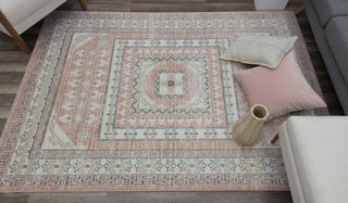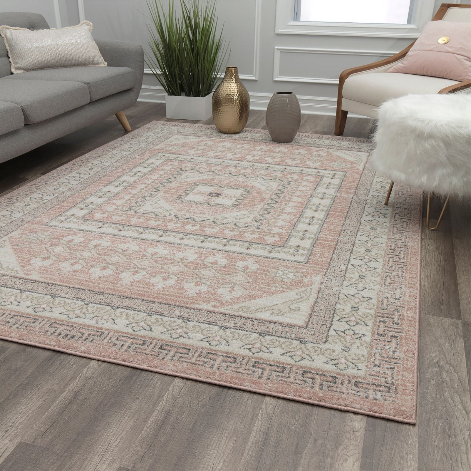 Introducing the Carnation Area Rug—like a striking work of art, this rug will captivate your attention. Featuring delicate florals and geometric shapes, the eye-catching motif is softened by blush and pearl hues. Power-loomed from polypropylene with a half-inch, shiny pile, this rug is both soft on your feet and highly durable. Perfect for adding charm to any room, the Carnation Area Rug combines beauty and functionality. Elevate your home decor with this exquisite piece.