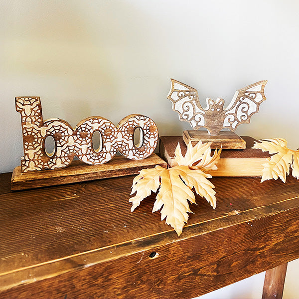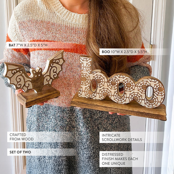 Add a hauntingly romantic twist to your seasonal setup with our Carved Wooden Halloween Boho Accents, Set of Two. Far from the flimsy plastic decor you’ll find elsewhere, this charming duo brings artisan craftsmanship and warm, rustic elegance to your Halloween home. The intricately carved "boo" features a lace-inspired design, while the playful bat flutters in with winged cutouts full of whimsical detail—both made to complement modern boho and farmhouse styles with ease.