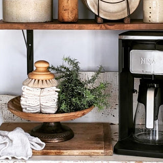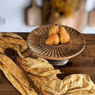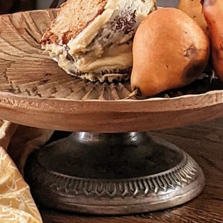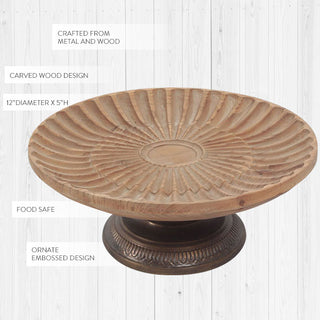 Take your decorative vignette to new heights with our Carved Wooden Cake Stand Riser. Crafted of wood and metal, this display stand is carved to perfection and has a pedestal-style base. The beautifully sculpted look and natural finish coordinates well with your vintage farmhouse home while adding extra dimension as well.