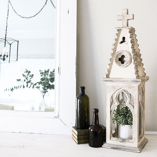 Inspired by the warmth of old churches this gorgeous lantern speaks stories to us! Use indoors OR outdoors with a real pillar candle or an LED light and add a soft glow to your home!! You could even place a small potted plant inside and display it on any tabletop mantel patio or porch and enhance the look of your décor. This stunning lantern will look great anywhere it’s IMPOSSIBLE to get enough!!!