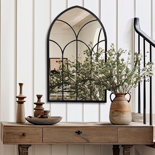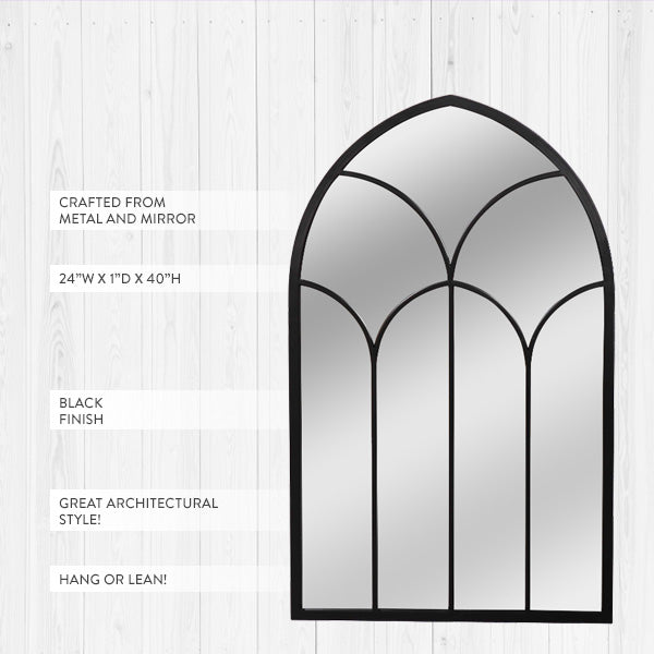 The arched black metal design gives a nod to the cathedral arches of the past mixed with the slim, sleek black frame of today's popular minimal, modern look! The exceptional design of this beautifully crafted wall mirror won’t go unnoticed and will be sure to brighten even the dullest space. This wall mirror exudes timeless elegance that is sure to make a statement and will magnify petite nooks and grand interiors alike! Perfect for adding a romantic touch, this stunning wall mirror will fill any home with its timeless beauty and personality.