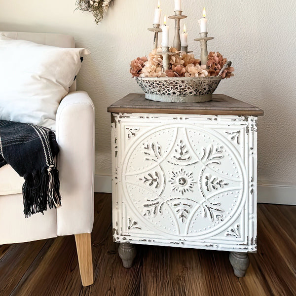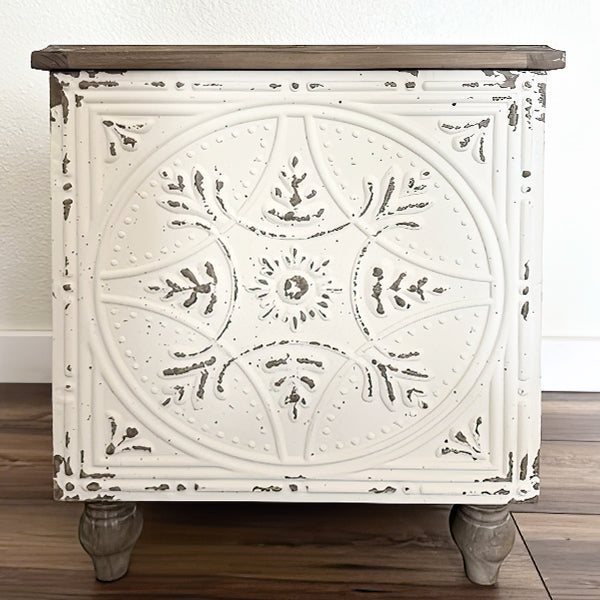 Every table tells a story with its unique ceiling tiles, making sure no two are exactly alike. Bring a piece of exceptional design into your home and enjoy the perfect mix of beauty and practicality with our Architectural Salvage Ceiling Tile Side Table. Get ready to transform your home decor with a touch of vintage charm and modern-day convenience!