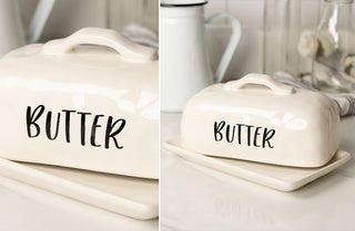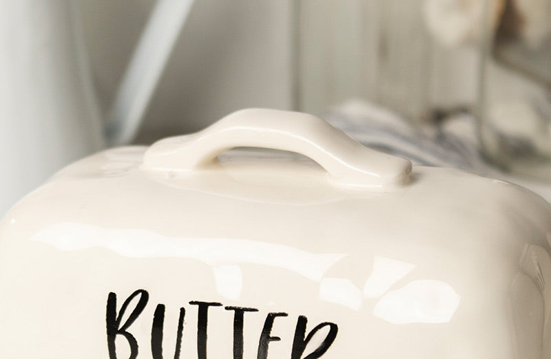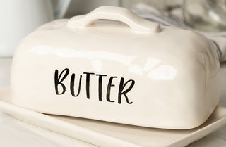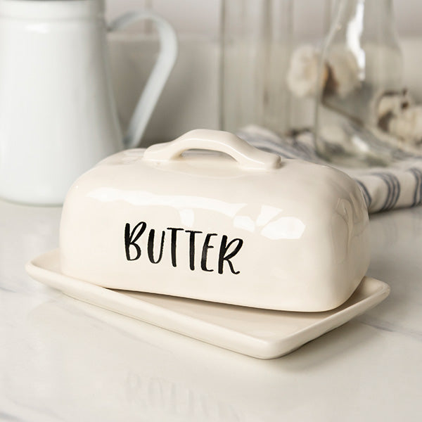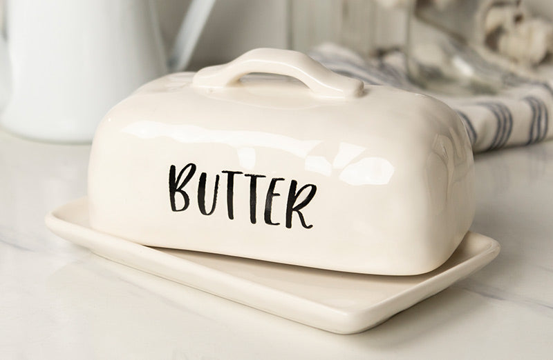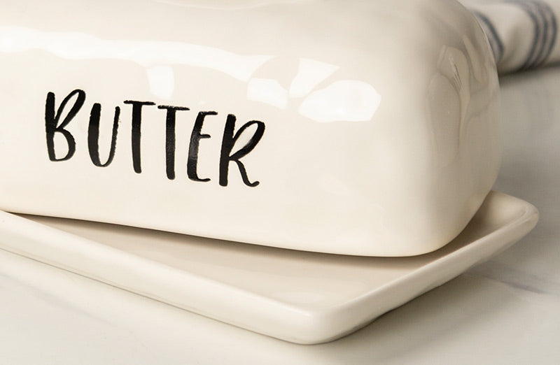 The soft buttery look and trendy black font of this SUPER fun and SUPER adorable ceramic butter dish and plate has us OBSESSED!!! Perfect for get-togethers family gatherings or everyday use this classic beauty will add charm and style to any table setting. We ABSOLUTELY LOVE everything about this gem and just know you will too! <3
