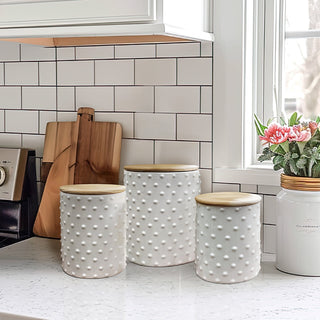 Crafted with a delightful hobnail pattern, these ceramic canisters bring a vintage touch to your kitchen. The classic white hue effortlessly complements any decor, offering a fresh and timeless look.