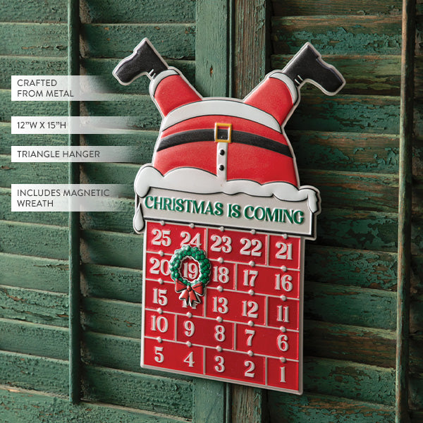 Get ready to countdown the days with a playful twist! Our Magnetic Christmas Countdown Metal Sign features a unique design that’s sure to bring some extra holiday cheer to your Christmas decor. A green magnetic wreath marks the date, while an upside-down Santa, with legs popping out from the top, adds a fun surprise on the red calendar. The countdown starts at 25 and goes all the way to 1, helping you build anticipation for the big day.