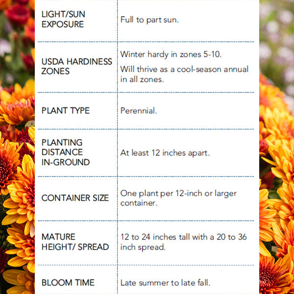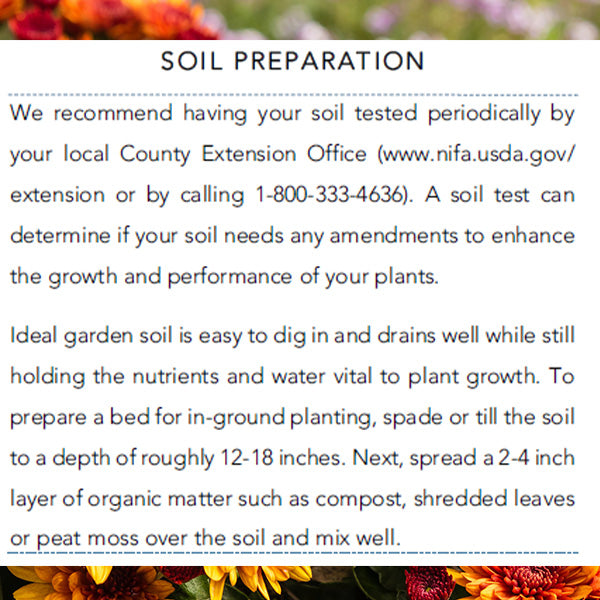 Special Note: Unfortunately, we cannot ship mums to California, as the nursery does not have credentials for CA.