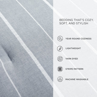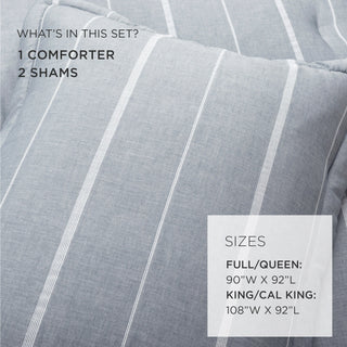 This Classic Farmhouse Chalk Stripe 3 Piece Comforter Set includes 1 comforter and 2 standard pillow shams. This cozy bedding set seamlessly blends with a traditional, coastal, cottage, or farmhouse style bedroom.