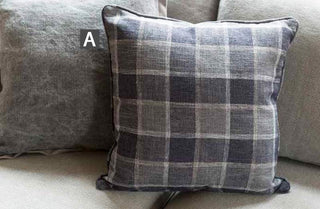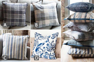 - Options: A: Deep Blue Checkered Pillow (18" x 18") B: Light Blue Plaid Pillow (22" x 22") C: Blue Striped Pillow (22" x 22") D: Bird Print Down Filled Pillow (22" x 22")