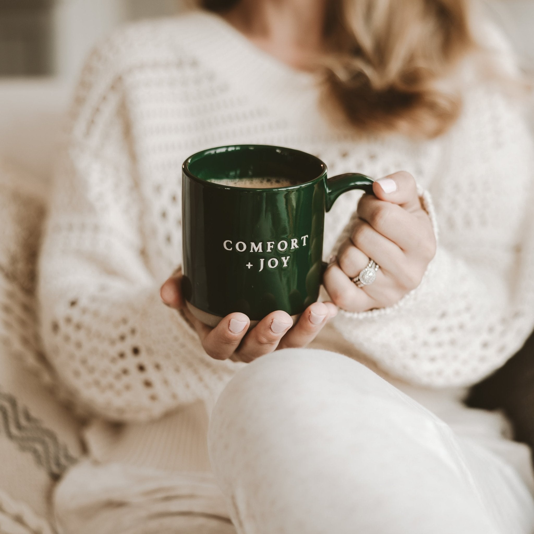 Make Christmas a little more cheerful this year with our Comfort and Joy green stoneware coffee mug. The sleek and modern design is crafted in green glazed stoneware with white debossed lettering, making it both stylish and durable. This festive Christmas coffee mug is perfect for morning coffee, afternoon tea, or a cup of hot cocoa by the fire. It's fun, beautiful and functional! Get one for yourself to bring some holiday cheer to your coffee bar or buy one as a Christmas gift!