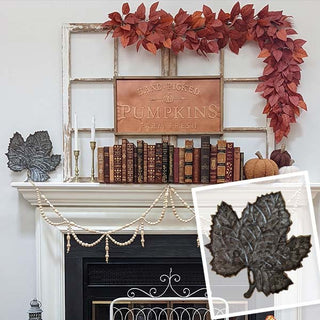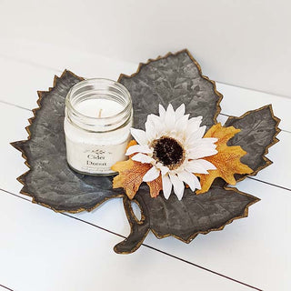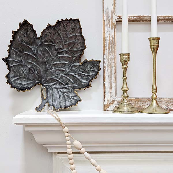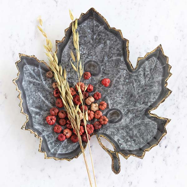 This Decorative Galvanized Leaf Tray can hold your favorite candy (candycorn, perhaps?), your keys or wallet in your entryway, or can be leaned up like artwork within your fall decor! You will FALL in LOVE with this metal tray with its distressed zinc finish, gold edges, and embossed life-like details!