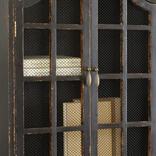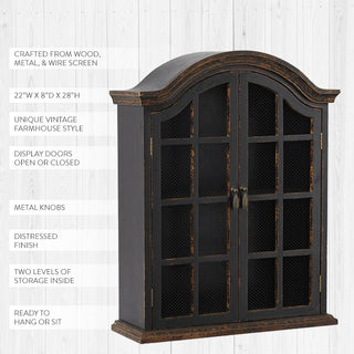 - Beautifully crafted of distressed wood and finished with metal knobs and metal wire screen.