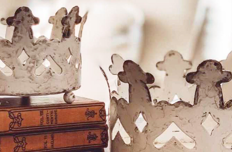 These Distressed Metal Crowns are something really SPECTACULAR! These unique pieces are made of chippy, aged metal and designed after the 1800's French Santos crown. The finish is simply A-M-A-Z-I-N-G... the distressing and the perfect patina all speak stories to us!