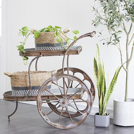This HAS to be one of the most fun steals we have brought you guys! This Distressed Metal Two-Tiered Planter Cart has so much farmhouse flair and will be the envy of all of your friends and neighbors! We can just see it now sitting among your garden areas packed full of your favorite potted beauties! What an eye-catcher! Don't stop there! This BEAUTY will be a show stopper on your front porches AND back porches! Place this metal flower cart among your patio furniture for a soothing and SUPER CUTE relaxing environment (we always recommend using a weather sealant for outdoor use)! Maybe you need a fun vintage storage area for all of your gardening tools... Well, we think this would be the perfect solution! Use this near your front door to catch purses, wallets and keys! Maybe even as a handy dandy side table or extra storage in the kitchen!