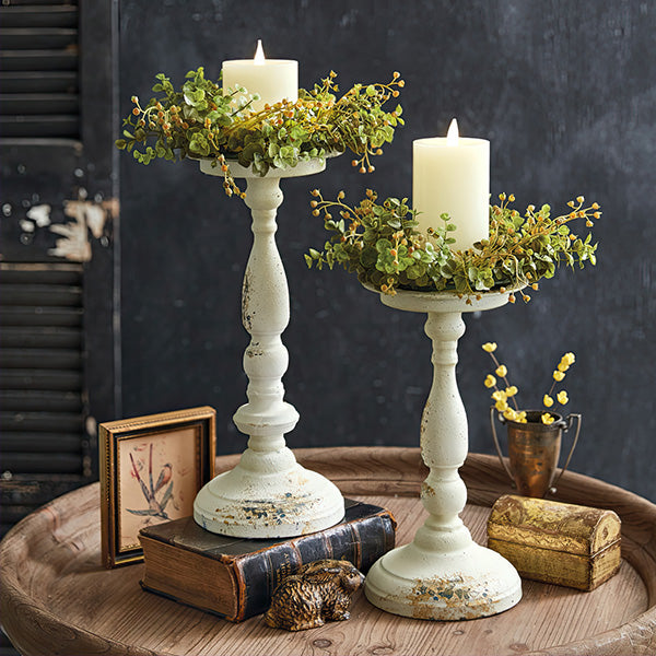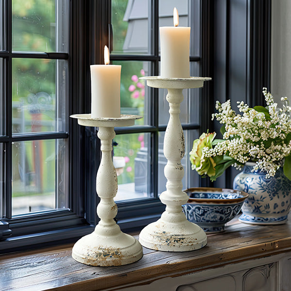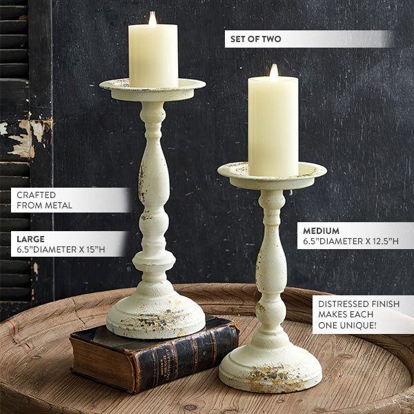 Set of 2: Double the delight with a perfectly matched pair of distressed pillar candle holders. Display them together to create a cohesive look, or separate them to add a touch of vintage charm to multiple spaces in your home.