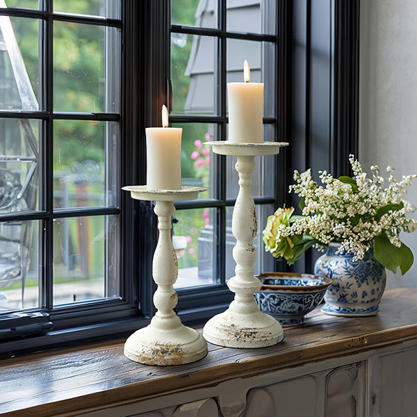 Vintage Appeal: Infuse your space with the allure of yesteryears with these distressed pillar candle holders. The weathered finish exudes vintage charm, adding character to any room.