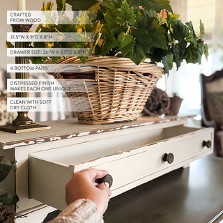 Bring rustic farmhouse charm and functional beauty to your space with our Distressed Table Top Wood Riser with Drawer! Designed with farmhouse elegance in mind, this versatile piece is perfect for adding extra storage and display space while keeping your decor effortlessly stylish. With its distressed wood finish and timeless appeal, this shelf is a must-have for any home looking for that cozy, lived-in look.
