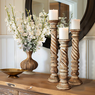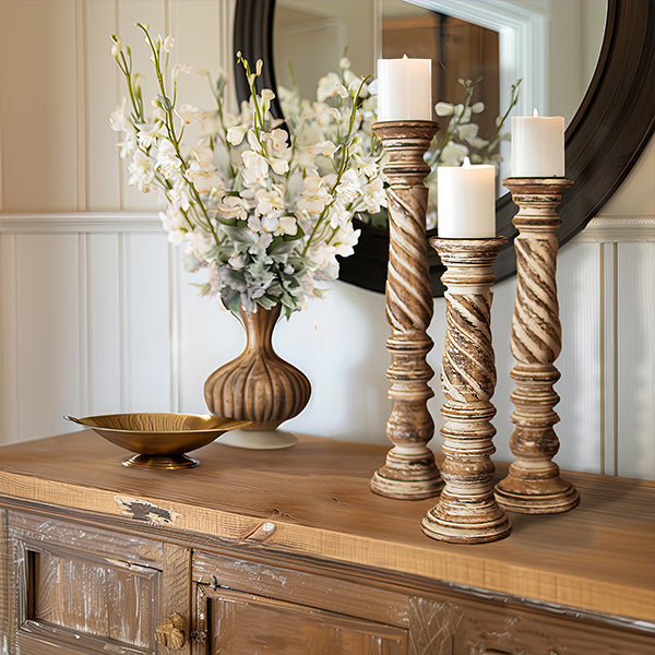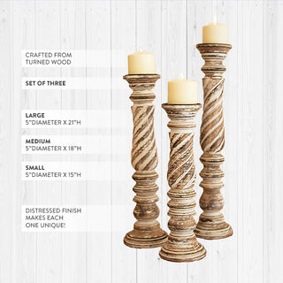 Set of Three: This collection includes three turned wood candle holders for versatile styling options throughout your home.