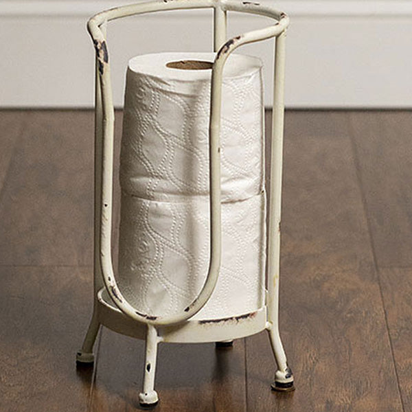 Crafted of durable metal with a delightfully chippy warm cream finish, this stand holds up to three rolls of toilet paper—one on the spindle and two stacked below—so you'll never be caught off guard.