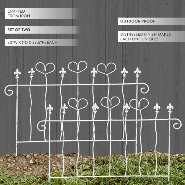 Add a romantic flourish to your outdoor space with this Fleur-de-lis Distressed White Garden Fence, the perfect accent for cottage core-inspired decor. Each panel features a charming mix of heart shapes and classic fleur-de-lis finials, all finished in a distressed white that brings vintage charm and timeless appeal to your garden beds, walkways, or patio corners. These fences don’t just define spaces—they elevate them.
