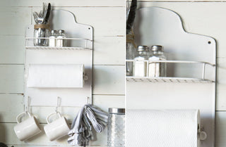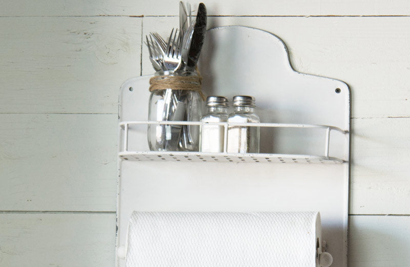 First things first... The FUNCTION of this piece truly makes this one a KEEPER! This features a beautiful shelf like top with an enclosure so that you can safely display all of your favorite spices mason jars or flower vases! Fill them with firefly lights and freshly picked flowers to really draw the eye up and create a beautiful pop of color! The middle of this rack ALSO has a perfectly placed rod to hold your paper towel rolls or dish towels! How handy!