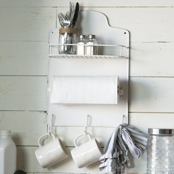 -Features 3 metal hooks one towel rod and a top shelf (mugs and accessories not included)